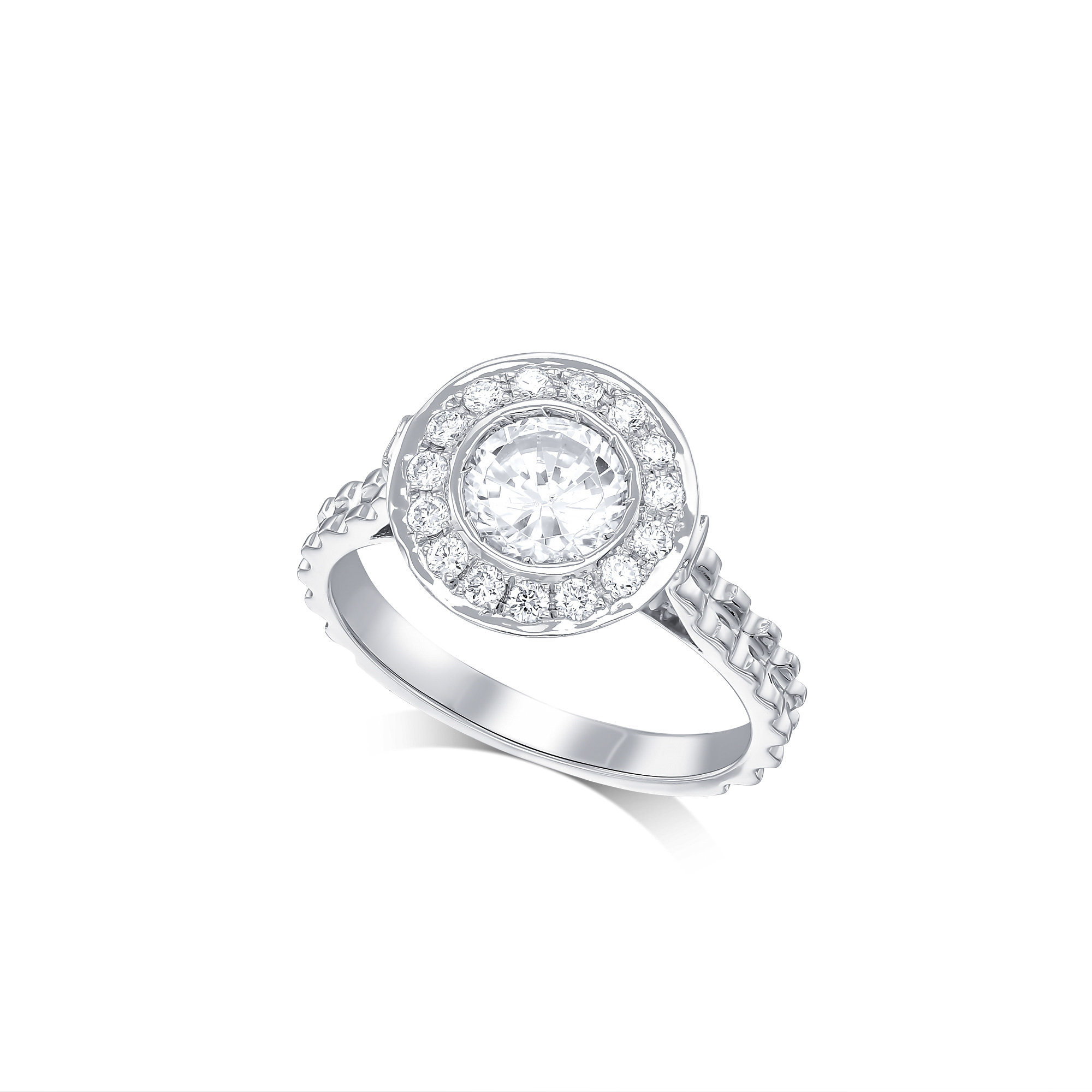 RT-20125 טבעת יהלומים מעוצבת. משובצת יהלום מרכזי עם יהלומים מסביב במדול חדשני ויפיפה...